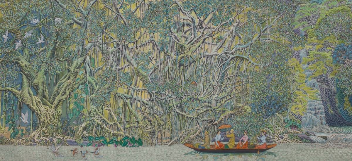 在《森林之歌》原件所在地,顾客一进入餐厅首先映入眼帘的就是载着五人的小舟:船尾的女子在悠然地划着桨,小舟前行,引导观者看向前面一群正要展翅起飞的水禽;视线顺着它们飞行的路线,穿过密不透风的树丛,随之来到一片有着远山和辽阔水域的画面——天高任鸟飞与海阔凭鱼跃的景象展现在我们的眼前。画面上层层递进的秩序感,以及人与自然的和谐共处一览无余。
