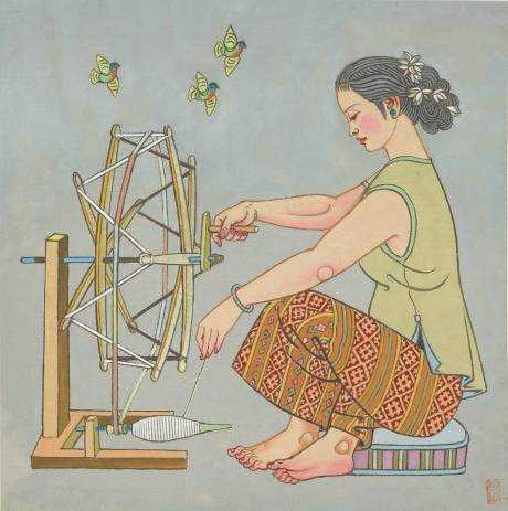 这种将曾经高不可及的意象用在普通人生活中的做法,还体现在《水果篮女子》这幅作品中。祝老用清朝时只有皇家才能使用的吉祥图案装饰了女子的围裙下摆,让昔日庙堂之高装点了人间烟火,再一次体现了装饰艺术为普通人服务的一贯宗旨。
