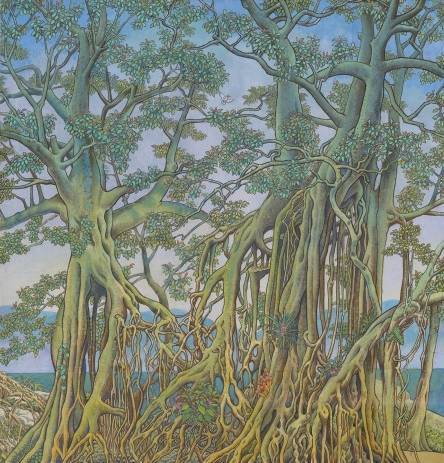 其实不只是裙子上的图案,女子的发式、头部形态、胸部的圆形和手势,或互补,或同步,或呼应,呈现的是一种自然生态的和谐。祝老并没有将作品命名为“两位女子”而是有血缘关系的“姐妹”,更加说明了和谐与共生的表达意图。祝老在作品中画山水、画树木,画表示时间的月亮或太阳,这是一个视觉版的音乐乐章。我们观看画作的每一个人成为了乐手。