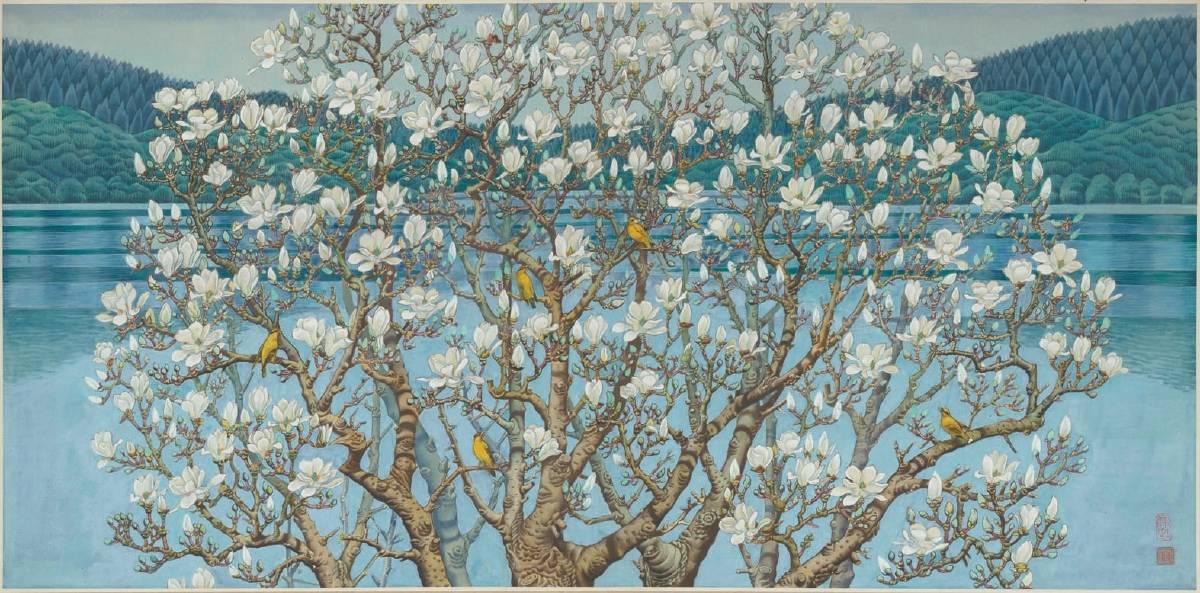 圆融,在中国哲学与美学中代表无与伦比的最高境界。圆融的哲学观点认为世界不是二元对立的,在美学中强调的是主体精神与客观自然的融合。祝老在文集中写道:“画面上玉兰盛开,有五个黄鹂鸣花间,是共和国春天的象征,背景是安定宁远的山水,以示春光永驻,使自然美、社会美、装饰美都能表现出来……树干用新彩渲染,强调花丛中的阴影,加强它的节奏感,来伴奏黄鹂的鸣叫。”