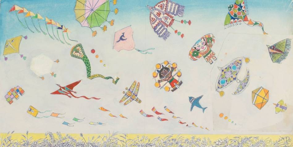 画面上的图样不仅仅来自中国,从风筝的设计稿和图案标注中,我们还看到了日本、德国、法国、斯里兰卡等国家的名字,这无疑是地球村居民和谐共处生活在同一片蓝天下的写照。